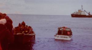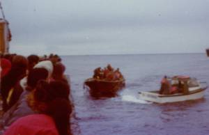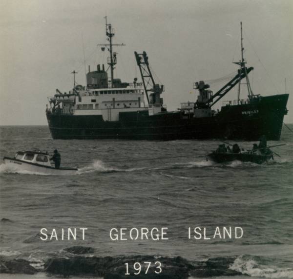 The primary way of getting to St. George Island during the early 1970s (and before) was via St. Paul Island on the the M/V Pribilof operated by the U.S. Department of Commerce. Visitors climbed down a Jacobs ladder from the ship into the bidar. The bidar was towed toward the concrete dock by the little St. George. When there was a high swell it could be quite tricky. The skipper had to time the landing just right so the bidar would not be smashed. Friend and relatives on the dock lean forward and immediately help haul the passengers and goods out of the bidar. This was a calm day.