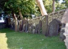 Gravestones lined up along the wall at St. Davids Cathedral,