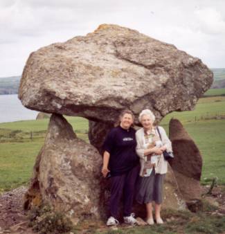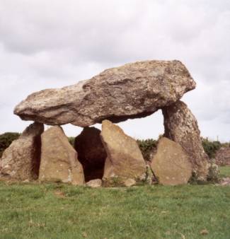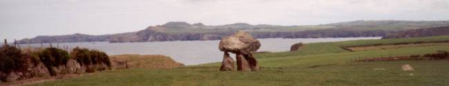 ![]() A cromlech in a sheep pasture near Trefin. Below a poem by Waldo Williams, Welsh Poet (died in 1971), reflecting on a cromlech. |