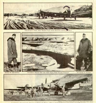 (T) Amchitka's Steel Mat Keeps P-40s From Bogging Down In Mud (C) Jones of Amchitka - Incoming Pilots See (on clear days) This Bleak Terrain - Buckner of Alaska (B)Lightening (foreground) Shuttles Steel To Kiska, DC-3s (behind) Shuttle Supplies From Mainland Official U.S. Army Photos-International, Associated Press, Acme |