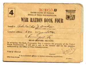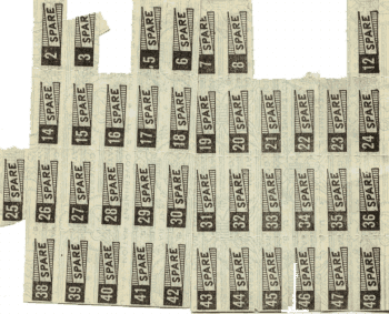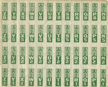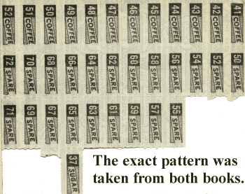 Book Four (right) was issued grandmother Adelaide Jeter Dickson, 340 Wyondotte, Shreveport, La. A second book was issued to my grandfather Donald C. Dickson. These books were well used. The only complete page (in both books) was green. The books contained at least two pages with black stamps marked SPARE. Only a few red (horn of plenty) and blue (wheet) stamps remain and they were loose in the books. |