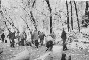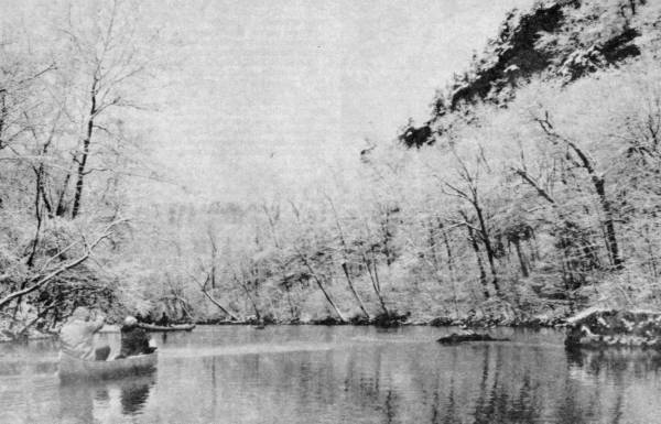 ![]() Somehow, Thanksgiving always seems to be a perfect day; the rest of the weekend is often a different story. The canoers met snow on Bryant Creek, above, in 1974 |