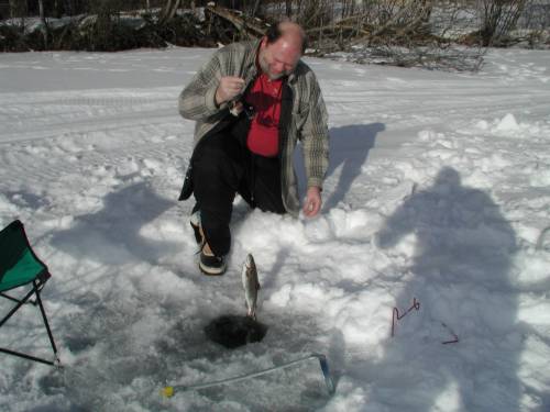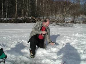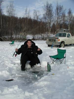 ![]() My friend and co-worker at the city Dan Barnhart cutting a hole for fish at Matanuska Lake Feb 24, 2002 |