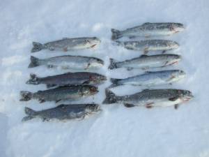 At most of the lakes in Anchorage and Matanuska-Susitna we can catch 5 of each species. If we were lucky we could go home with fifteen fish each. We catch mostly Rainbow in summer and winter. Silvers are next except in the summer we catch lots of Arctic Grayling which are a smaller fish.