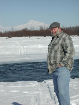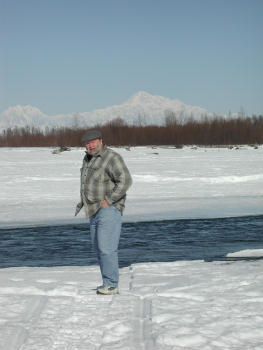 Donald Eubank in front of Mt McKinley or its sister mountain at the river at Talkeetna Alaska.