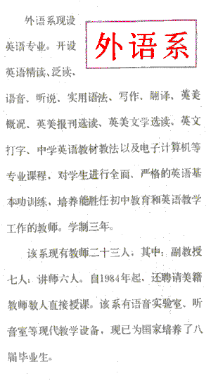 We have an English Program in the Foreign Languages Department now. We provide courses of English and Skimming Reading, English Pronunciation, English Listening and Speaking, Practical English Grammar, English Composition, English Translation, Introduction of Western Societies, English News Reading, Introduction of English Literature, English Typing, English Teaching Methods in High School, Computer Training, etc. By our overall and strict English Training, students from our school can handle English teaching in high school. This is a three-year program.