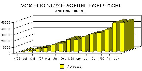 Steady, positive growth, on a quarterly basis, from April 1996 to July 1999 is shown by the chart below. In general, a site is considered successful when it has 10,000 'hits' per month. That point was passed in October of 1997. The SFRH&MS is now approaching 50,000 'hits' per month.