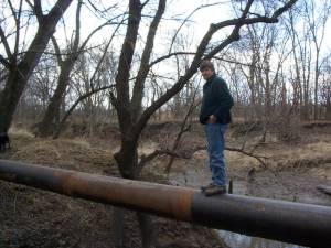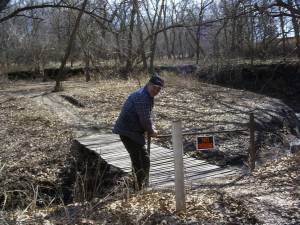 Another bridge maintained by Randy. The toll could be steep for the wrong party. Randy relocks the toll gate. |