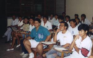 Arrangements were made for the students to come to the elementary school in the middle of the town. Club members cleaned and painted two school rooms on the Saturday and Sunday before classes were to start. We helped put the desks back in the classrooms on Monday before we started classes. Each room contained about 30 student desks, a real black board, lights and two overhead fans for air circulation. On several days it was very warm which made teaching a bit of a strain.