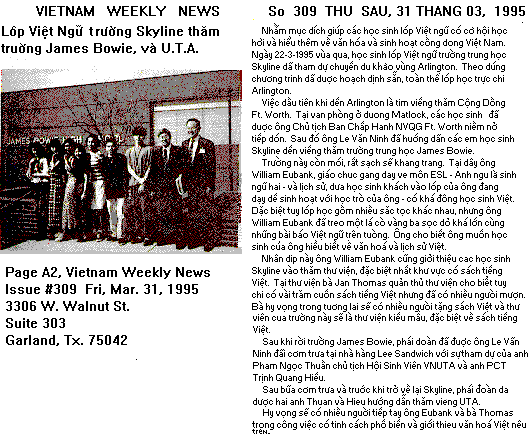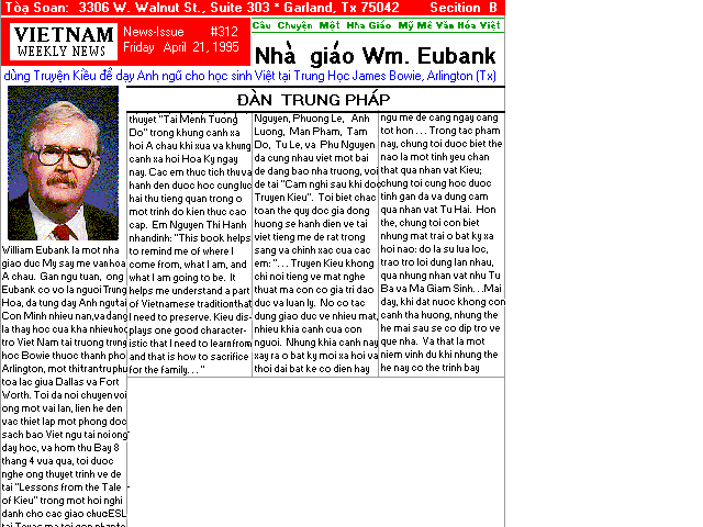 In April, 1995 I made a presentation to the TEXTESOL V Spring Conference, at the University of North Texas, Denton, Texas. Dr. Dam Trung Phap, director of World Languages for Dallas Public School System attended my presentation and offered to write an article for the VIETNAM Weekly News of Dallas - Fort Worth. The article and pictures (32K) are included in .gif format so that the Vietnamese fonts might be viewed by those that do not have such a viewer on their browser. The words of the text are as close to the original as I could type them - the actual layout of the page is slightly different than the original article. An English version of the news report was translated for me by my students and Mr. Nguyen.