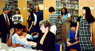 Vietnamese(23K) students from Skyline High School in Dallas visit Bowie High School ESL. They had heard about Bowies' Vietnamese/English book section in the school library (41K) and came to see the collection. The article appeared in the Vietnamese Weekly News in Dallas.